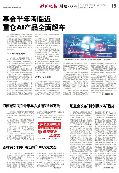 证监会发布“科创板八条”措施   证监会6月19日发布了《关于深化科创板改革 服务科技创新和新质生产力发展的八条措施》(下称“科创板八条”),进一步深化科创板改革,强化科创板“硬科技”定位,提升资本市场对新产业新业态新技术的包容性。