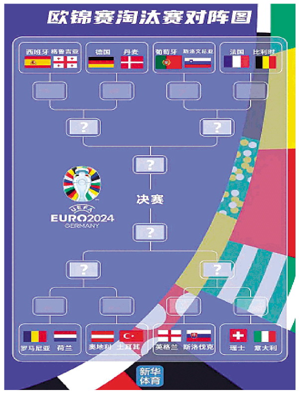 目前,淘汰赛阶段首轮的对阵已经全部确定。上半区为西班牙队对阵格鲁吉亚队,德国队对阵丹麦队,葡萄牙队对阵斯洛文尼亚队,法国队对阵比利时队。下半区为荷兰队对阵罗马尼亚队、奥地利队对阵土耳其队、英格兰队对阵斯洛伐克队、意大利队对阵瑞士队。