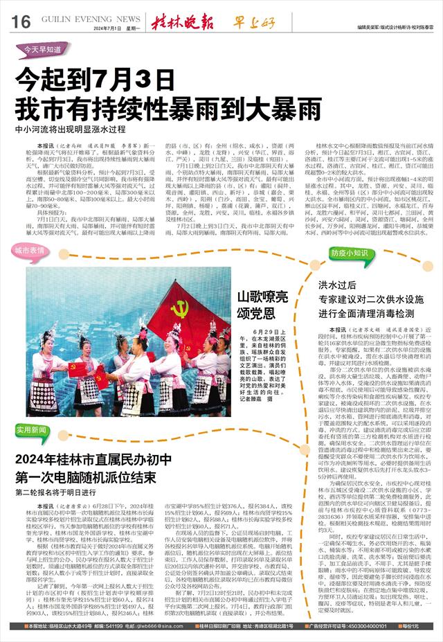 7月1日白天,我市中北部阴天有暴雨、局部大暴雨,南部阴天有大雨、局部暴雨,并可能伴有短时雷暴大风等强对流天气。最有可能出现大暴雨以上降雨的县(市、区)有:全州(绍水、咸水),资源(两水、中峰),龙胜(龙脊),兴安(华江、界首、溶江、严关),灵川(九屋、兰田)及临桂(宛田)。