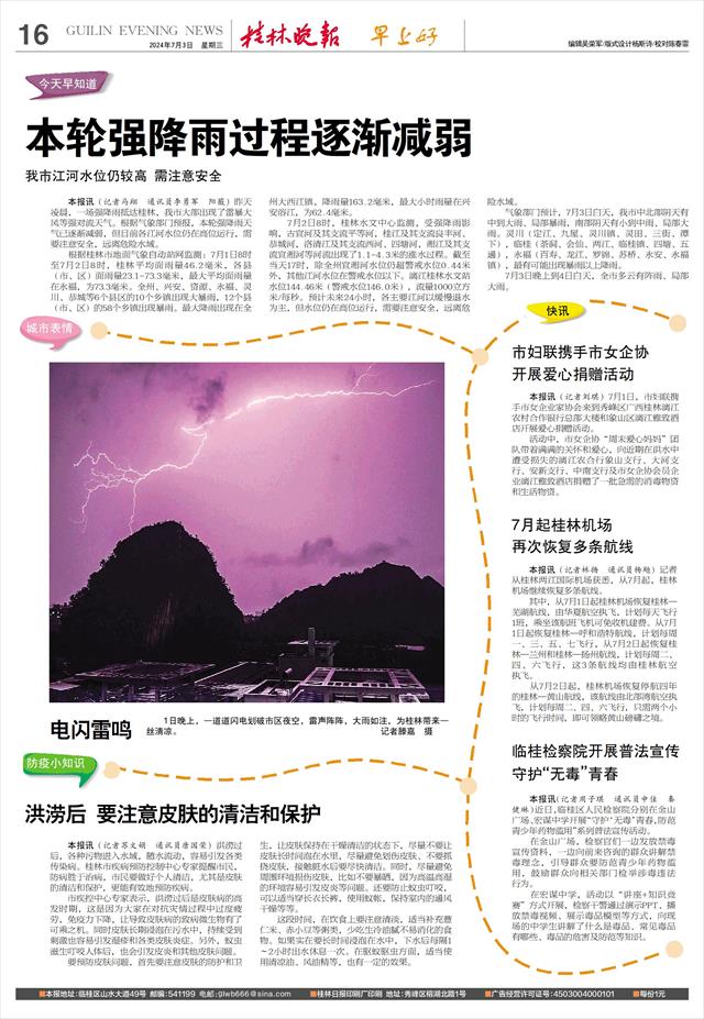 本轮强降雨过程逐渐减弱 我市江河水位仍较高 需注意安全   本报讯(记者马翔 通讯员李勇军 阳薇)昨天凌晨,一场强降雨抵达桂林,我市大部出现了雷暴大风等强对流天气。根据气象部门预报,本轮强降雨天气已逐渐减弱,但目前各江河水位仍在高位运行,需要注意安全,远离危险水域。