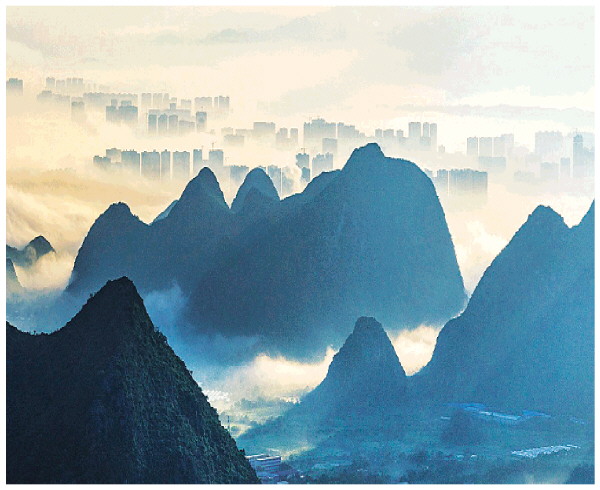 4日早上,桂林的天空终于放晴。记者在侯山附近通过无人机拍摄到,阳光下远处的山峰和城市建筑在雾气中若隐若现,真是雨后美景如画。 记者滕嘉 摄