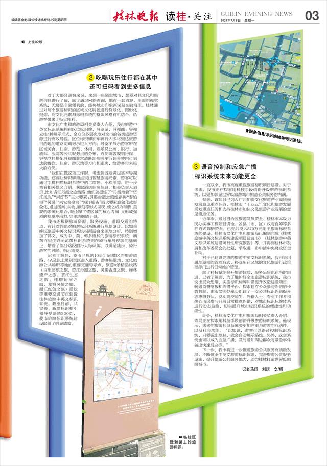 此外,桂林市文化广电和旅游局相关负责人介绍,该局正在探索用科技手段创新升级旅游标识系统。他表示,未来的旅游标识系统要更加注重与游客的互动性,以及社会功能。“比如说,游客可以语音控制标识系统,只要说出地名,就会自动展示路线。另外,这套系统也可以成为应急广播,及时通知周边群众对紧急事件做出快速反应等。”