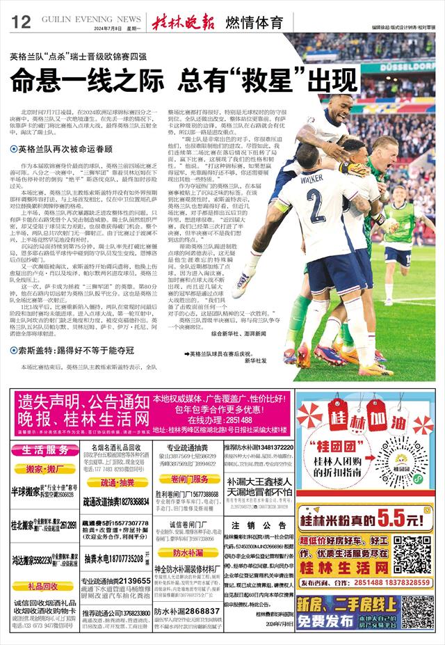 北京时间7月7日凌晨,在2024欧洲足球锦标赛四分之一决赛中,英格兰队又一次绝境逢生。在先丢一球的情况下,依靠萨卡的破门将比赛拖入点球大战,最终英格兰队五射全中,淘汰了瑞士队。