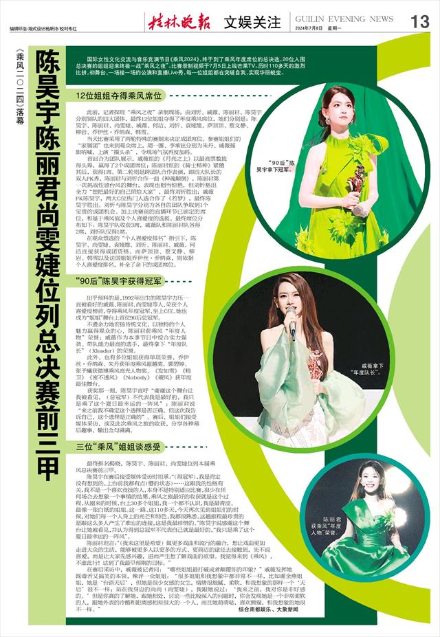 获奖那一刻,陈昊宇直呼“谢谢这个舞台让我被看见,(总冠军)不代表我是最好的,我只是乘了这个夏日最幸运的一阵风”;陈丽君说“来之前我不确定这个选择是否正确,但这次我告诉自己,这个选择是正确的”。赛后,姐姐们接受媒体采访,谈及此次乘风之旅的收获,分享各种幕后趣事,输出金句满满。