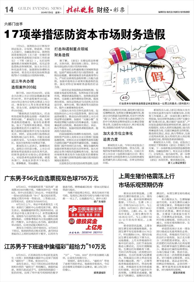 7月5日,国务院办公厅转发中国证监会、公安部、财政部、中国人民银行、金融监管总局、国务院国资委制定的《关于进一步做好资本市场财务造假综合惩防工作的意见》(下称《意见》),从打击和遏制重点领域财务造假、优化证券监管执法体制机制、加大全方位立体化追责力度、加强部际协调和央地协同、常态化长效化防治财务造假等5个方面提出17项具体举措。.