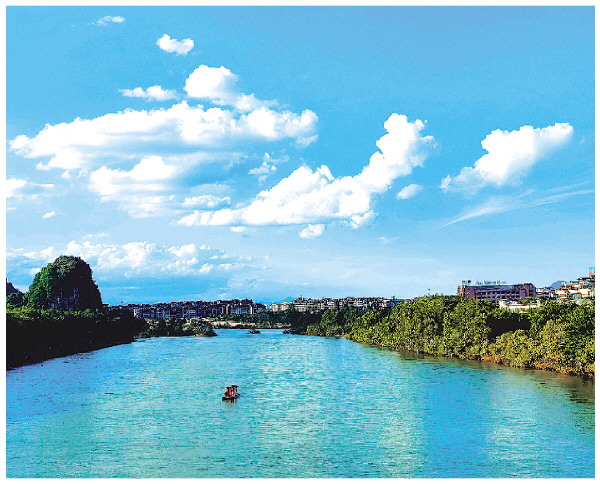 7日,桂林晴好天气持续,在漓江解放桥上游,蓝天白云与青山绿水构成了一幅美景。 记者邢刚 摄