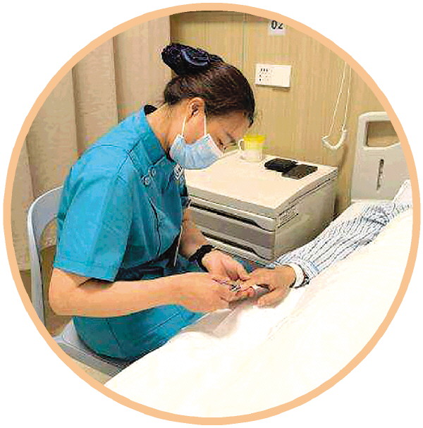 ↑“无陪护”病房的专业护理员正在护理病人。