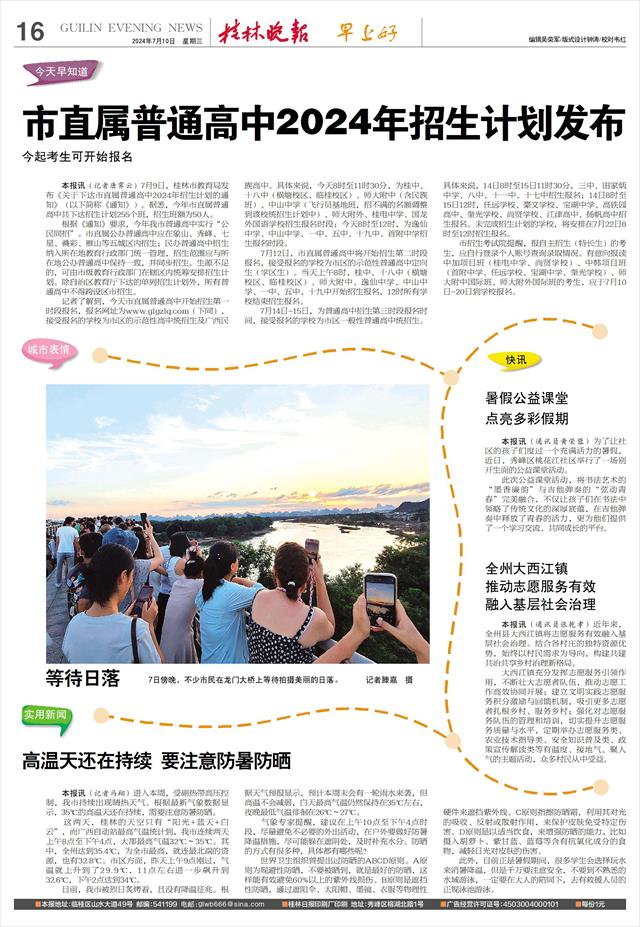本报讯(记者唐霁云)7月9日,桂林市教育局发布《关于下达市直属普通高中2024年招生计划的通知》(以下简称《通知》)。据悉,今年市直属普通高中共下达招生计划255个班,招生班额为50人。