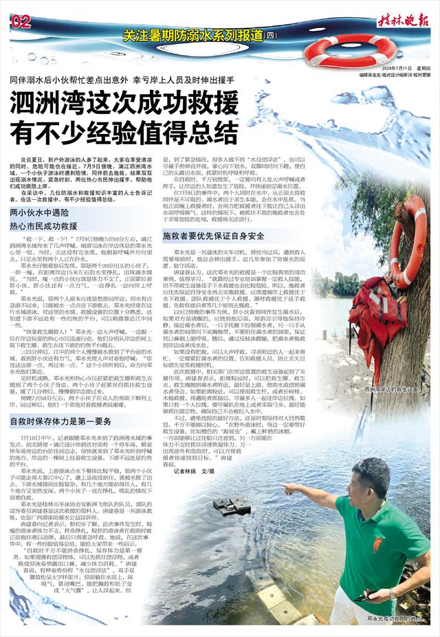 有不少经验值得总结   炎炎夏日,到户外游泳的人多了起来。大家在享受清凉的同时,危险可能也在接近。7月9日傍晚,漓江泗洲湾水域,一个小伙子游泳时遇到险情,同伴前去施救,结果双双出现溺水情况。紧急时刻,两位热心市民伸出援手,帮助他们成功脱险上岸。