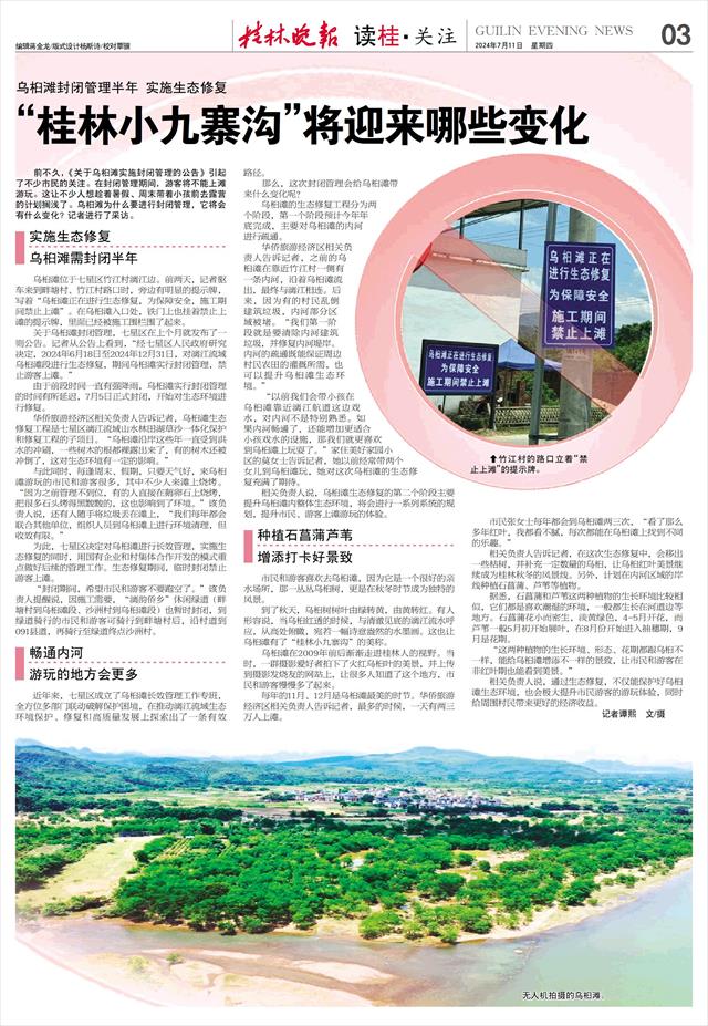 乌桕滩封闭管理半年 实施生态修复 “桂林小九寨沟”将迎来哪些变化   前不久,《关于乌桕滩实施封闭管理的公告》引起了不少市民的关注。在封闭管理期间,游客将不能上滩游玩。这让不少人想趁着暑假、周末带着小孩前去露营的计划搁浅了。乌桕滩为什么要进行封闭管理,它将会有什么变化?记者进行了采访。