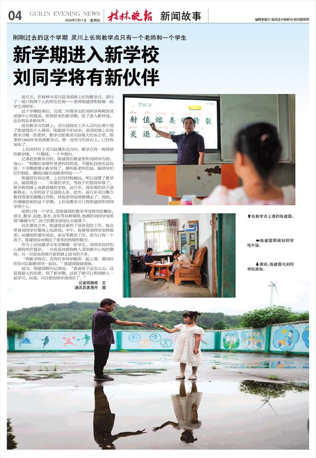 刘同学将有新伙伴   前几天,在桂林市灵川县灵田镇上长岗教学点,进行了一场只有两个人的师生告别——老师陈建国和他唯一的学生刘同学。