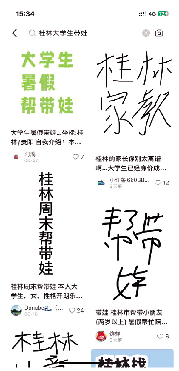 家住龙光普罗旺斯小区的张慧在杭州上大学,暑假回桂林有两个月时间,也在小红书上发布了带娃求职帖。她告诉记者,今年春季学期开学以来,她就在杭州接到了首个带娃任务,为一名低年级学生提供接放学和辅导服务。“具体的工作就是下午去学校把孩子接回小区,然后给他辅导一到两个小时,等家长下班就离开。收费是三个小时120元。”她说,这几天她也接到不少桂林意向客户的咨询,就目前情况来看,桂林的收费会大大低于杭州。