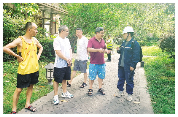 唐斌(右二)等物管会成员在和专业人士讨论电梯检修问题。 记者苏文娟 摄