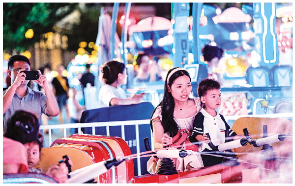 近日,在翠竹路万象城附近,一名家长带着小朋友在玩游乐设施,让孩子度过一个开心的夜晚。记者滕嘉 摄