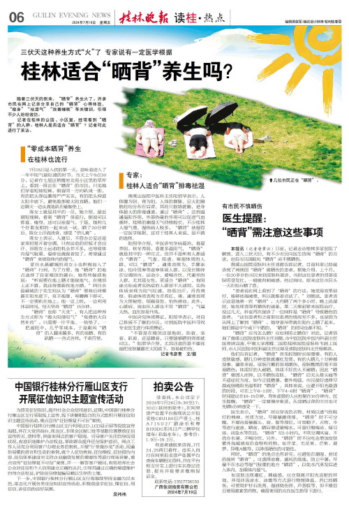 三伏天这种养生方式“火”了 专家说有一定医学根据 桂林适合“晒背”养生吗?   随着三伏天的到来,“晒背”养生火了。许多市民在网上记录分享自己的“晒背”心得体验,“瘦身”“祛湿气”“改善睡眠”等关键词,引得不少人纷纷效仿。