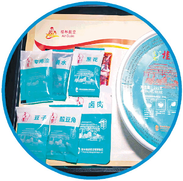 记者看到,一份专供给桂林航空的碗装米粉,尺寸约为市面上的碗装方便面大小,采用浅蓝色外包装,构图展现榕湖集团景象。内含一份鲜湿米粉,专用油、卤水、葱花、豆子、酸豆角、卤肉等6包小料。为了让米粉更加软糯易泡开,小料新鲜入味,榕湖集团升级了生产工艺,对每一包卤水量精确适配,更接近堂食米粉的口感和味道,以达到“还原正宗桂林米粉”的宗旨。