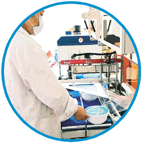 在榕湖集团的生产车间,工作人员正在对碗装桂林米粉进行封膜。记者马翔 摄