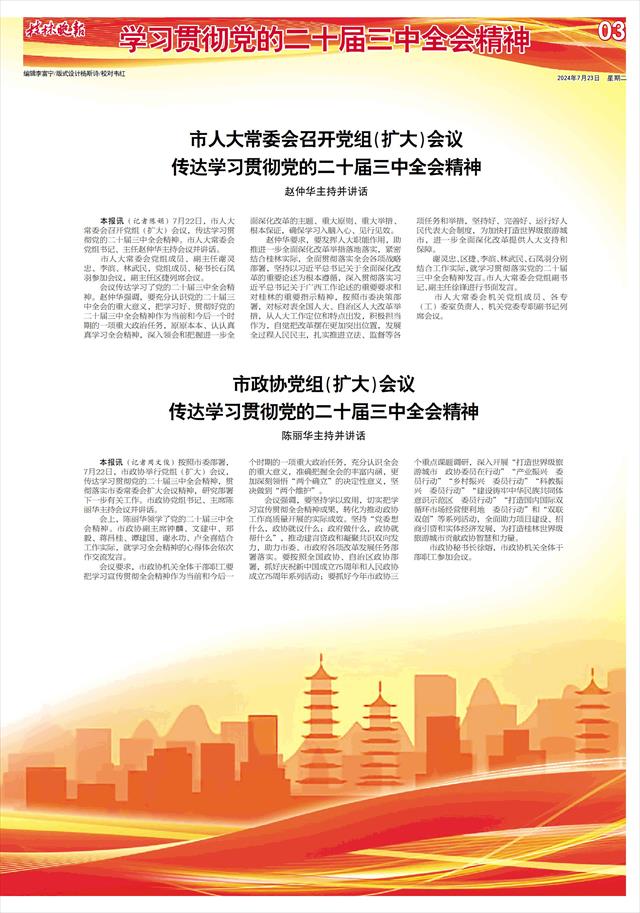 本报讯(记者陈娟)7月22日,市人大常委会召开党组(扩大)会议,传达学习贯彻党的二十届三中全会精神。市人大常委会党组书记、主任赵仲华主持会议并讲话。