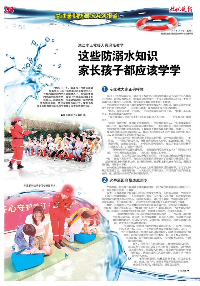 7月20日上午,漓江水上搜救志愿者服务中心(以下简称漓江水上搜救中心)在訾洲公园内的中心基地举办了一场别开生面的防溺水现场教学,吸引了许多家长和孩子积极参与。活动现场,专家详细讲解了溺水的危害和预防措施,结合实例和互动环节,使家长和孩子在轻松愉快的氛围中掌握了宝贵的防溺水知识。