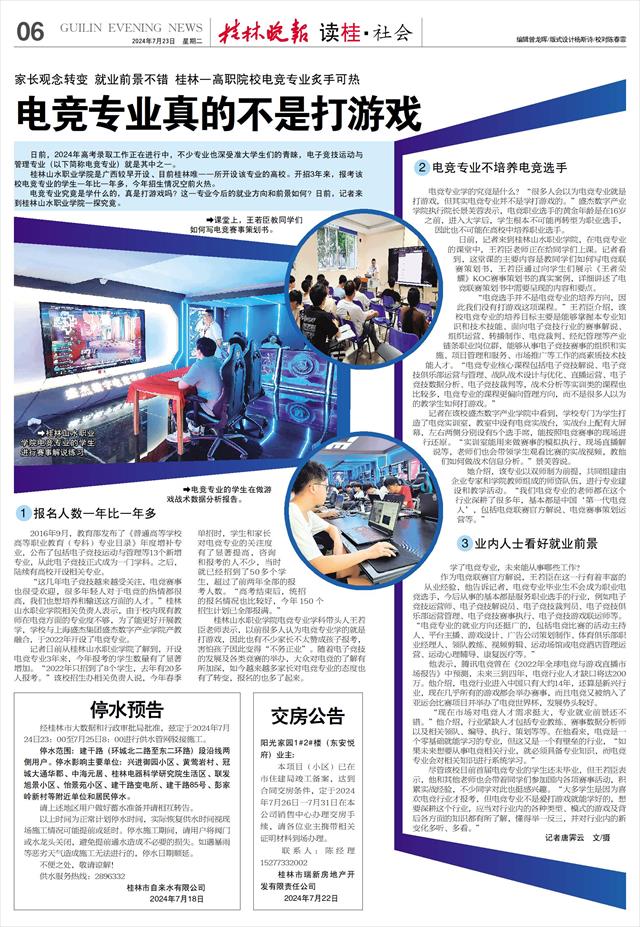 记者日前从桂林山水职业学院了解到,开设电竞专业3年来,今年报考的学生数量有了显著增加。“2022年只招到了8个学生,去年有20多人报考。”该校招生办相关负责人说,今年春季单招时,学生和家长对电竞专业的关注度有了显著提高,咨询和报考的人不少,当时就已经招到了50多个学生,超过了前两年全部的报考人数。“高考结束后,统招的报名情况也比较好,今年150个招生计划已全部报满。”