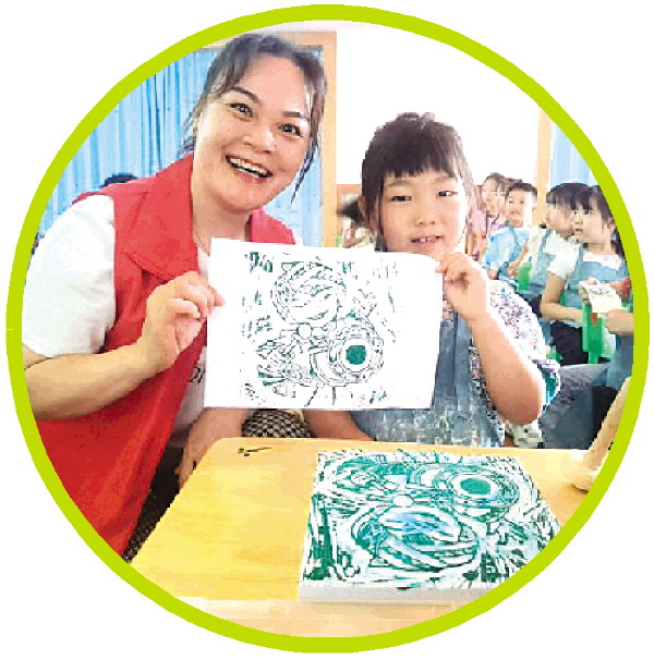 小朋友开心地展示拓印的版画。 (屏风村委供图)