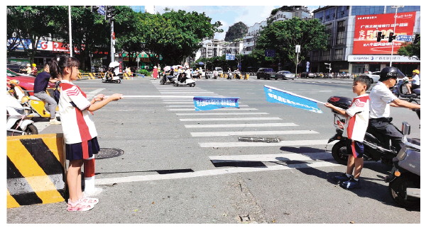↑暑假里,铁路社区的孩子们走上街头,当上了交通文明劝导员。 (铁路社区供图)