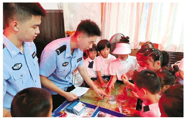 ↑民警通过实物展示,让宝积社区的孩子们分辨毒品,远离毒品。 (宝积社区供图)