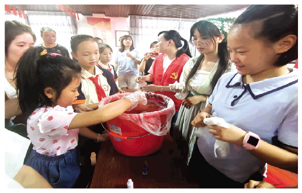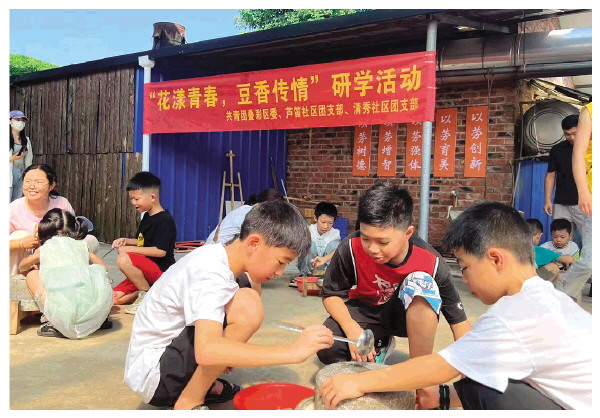 叠彩区叠彩街道芦笛、清秀社区联合开展的暑假活动也让人耳目一新。芦笛、清秀社区团支部联合共青团叠彩区委开展“花漾青春,豆香传情”研学活动。活动中,孩子们在向导的引导下认识植物种子,亲手体验作物栽培。大家还体验了传承几千年的古法豆腐工艺,通过碾磨、过滤、煮浆、点卤等过程,制作出味道香醇的老豆腐。社区工作人员还在活动现场给孩子们宣传了禁毒知识。这次研学活动不仅是一次知识的探索之旅,更是一次传统文化的体验之旅,让孩子们在实践中感受劳动的乐趣,体会自然的魅力。