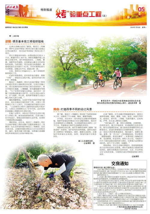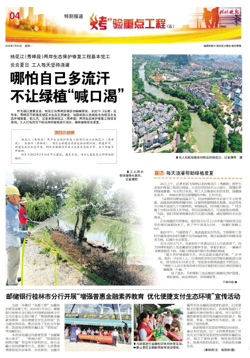 不让绿植“喊口渴”   作为漓江重要支流,桃花江在秀峰区辖区内蜿蜒穿流,长达15.3公里。近年来,秀峰区不断推进辖区水生态文明建设,加强桃花江流域综合治理及水生态环境修复。前几天,记者来到桃花江(秀峰段)两岸生态保护修复工程项目现场,工人们在烈日下给沿岸的植物进行浇水,确保植物安全度夏。