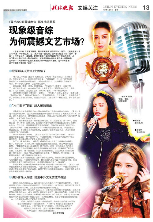 为何震撼文艺市场?   《歌手2024》日前落下帷幕,最终那英摘得《歌手2024》冠军。《我是歌手》自2013年第一季开播以来,这一系列节目不仅成为了国内音乐综艺(以下简称“音综”)不可缺少的一段旋律,更对中国流行音乐的发展产生了深远的影响。从冷门歌手的翻红到新人歌手的崛起,从海外流行音乐的入侵到本土新歌的首发平台……大热音综一直肩负着提升大众审美能力的重任,另一方面也推进了中国流行音乐的“进步”。