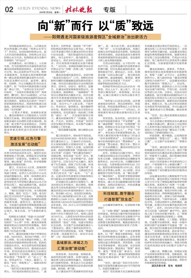 一江碧水千重景,全域新治更迷人。遇龙河展现在人们眼前的人与自然和谐共生画卷,背后是阳朔县因地制宜创新县域社会治理和文旅全域治理,抢占新一轮文旅产业变革制高点、开辟发展新领域新赛道、培育发展新动能、增强竞争新优势所进行的持续不断的努力。