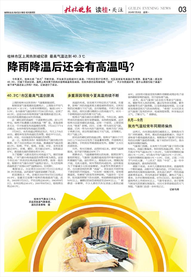 桂林市区上周热到破纪录 最高气温达到40.3℃ 降雨降温后还会有高温吗?   今年夏天,桂林大部“热力”不断升级,不仅多天出现超35℃高温,7月26日至27日两天,市区连续发布高温红色预警,最高气温一度达到40.3℃,打破了历史纪录。虽然上周末降下的雨水使得高温有些减弱,但炙热感仍没有被彻底“浇灭”。不少市民挺好奇,是什么原因引起了高温?接下来气温还会上升吗?对此,记者进行了采访。