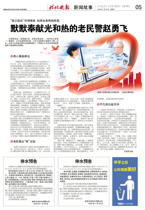 “能文能武”热情服务 钻研业务再续新篇 默默奉献光和热的老民警赵勇飞   办理身份证、港澳通行证,处理交警业务……桂林市公安局“一窗通办”大厅总是特别忙碌,工作人员常常忙得顾不上喝一口水。在这个以年轻女警为主的服务窗口,9号窗口今年58岁的老民警赵勇飞就显得比较特殊。