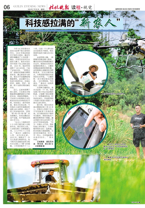科技感拉满的“新农人”   今年34岁的秦永兴是灵川县潭下镇大泉村的村民。2018年他回到家乡开始自主创业,通过生猪养殖赚到了人生的第一桶金。在现代农业风生水起的大潮下,秦永兴也在其中找到了自己的职业前景。2021年,他在村里流转了100亩水田,干起了家庭农场,“智慧农业”是他的农场最为鲜明的标签。通过参加学习培训,秦永兴不仅能熟练驾驶旋耕机,还会操作无人机进行喷洒作业。农场从育苗、插秧、管护、收割、烘干全部实现机械化作业。