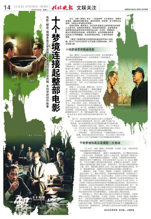 电影《解密》根据茅盾文学奖获奖者麦家同名小说改编 主创讲述创作故事 十个梦境连接起整部电影   近日,电影《解密》举办“一起造梦吧”北京首映礼,原著作者麦家,编剧兼导演陈思诚,演员刘昊然、陈道明、俞飞鸿等主创亮相,与观众分享电影创作故事。