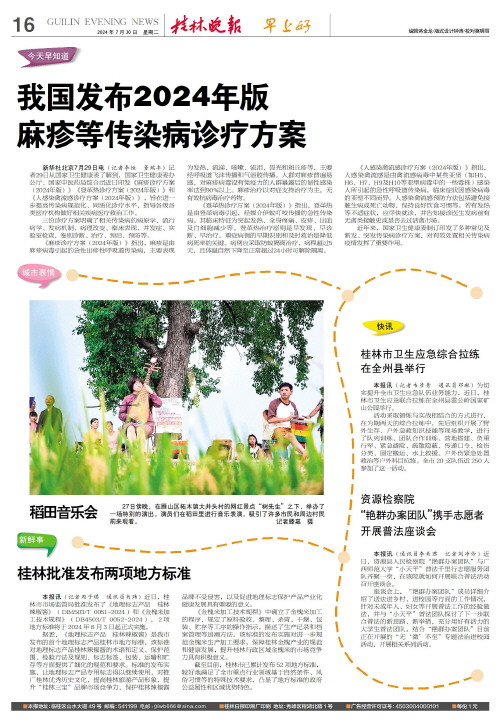 麻疹等传染病诊疗方案   新华社北京7月29日电(记者李恒 董瑞丰)记者29日从国家卫生健康委了解到,国家卫生健康委办公厅、国家中医药局综合司近日印发《麻疹诊疗方案(2024年版)》《登革热诊疗方案(2024年版)》和《人感染禽流感诊疗方案(2024年版)》,旨在进一步提高传染病规范化、同质化诊疗水平,指导各级各类医疗机构做好相关疾病医疗救治工作。
