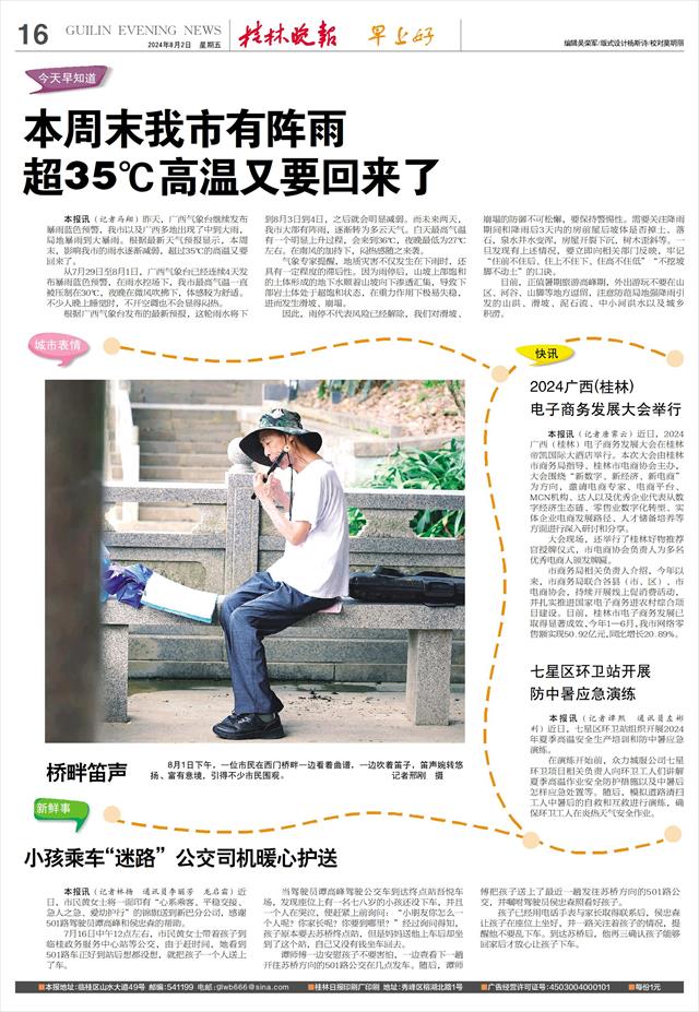 桥畔笛声   8月1日下午,一位市民在西门桥畔一边看着曲谱,一边吹着笛子,笛声婉转悠扬、富有意境,引得不少市民围观。 记者邢刚 摄