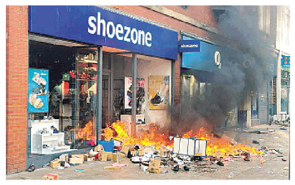 在南港,当地数百人走上街头抗议,他们与前来维持秩序的警察发生激烈冲突,抗议者向警察投掷燃烧瓶、砖块,有39名警察在冲突中受伤;在伦敦,数千名抗议者在首相官邸附近与警察发生暴力冲突;在桑德兰的抗议活动中,一栋警察局大楼被洗劫一空,相邻建筑物被纵火焚烧;在贝尔法斯特,抗议者在清真寺外砸碎了一家咖啡馆的窗户,并向媒体记者投掷砖头。