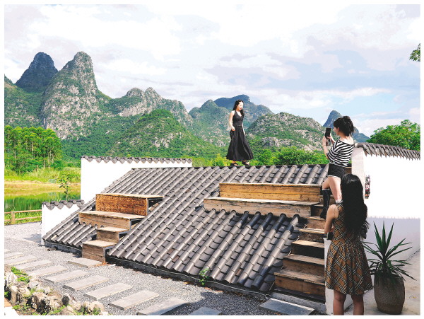 8月3日下午,三位女生在七星区朝阳乡司公村一个小院建造的“屋顶”拍照,她们换着不同动作造型,领略“顶上”风景的快乐。