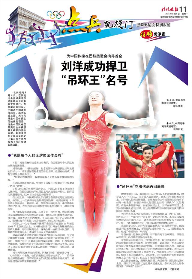 “吊环王”名号   北京时间8月4日,巴黎奥运会体操男子吊环决赛在贝尔希体育馆举行。东京奥运会冠军、中国选手刘洋夺得冠军,成功实现卫冕。男子吊环是中国体操队传统优势项目,这是中国队在巴黎奥运会体操项目上收获的首枚金牌,刘洋也成为了奥运会历史上第三位夺得两枚男子吊环金牌的运动员。