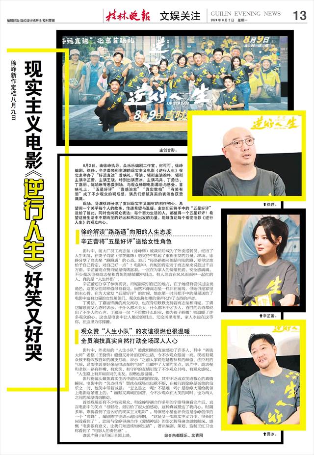 徐峥新作定档八月九日 现实主义电影《逆行人生》好笑又好哭   8月2日,由徐峥执导,众乐乐编剧工作室、何可可、徐峥编剧,徐峥、辛芷蕾领衔主演的现实主义电影《逆行人生》在北京举办了“好运直达”首映礼。导演、领衔主演徐峥,领衔主演辛芷蕾,主演王骁,特别出演贾冰,主演冯兵、丁勇岱、丁嘉丽、陈哈琳等悉数到场,与观众畅聊电影幕后与感受。首映礼上,“五星好评”“喜感治愈”“真实敢拍”“有笑有泪”成了不少观众的观后感,演员们细腻真实的表演也获赞满满。