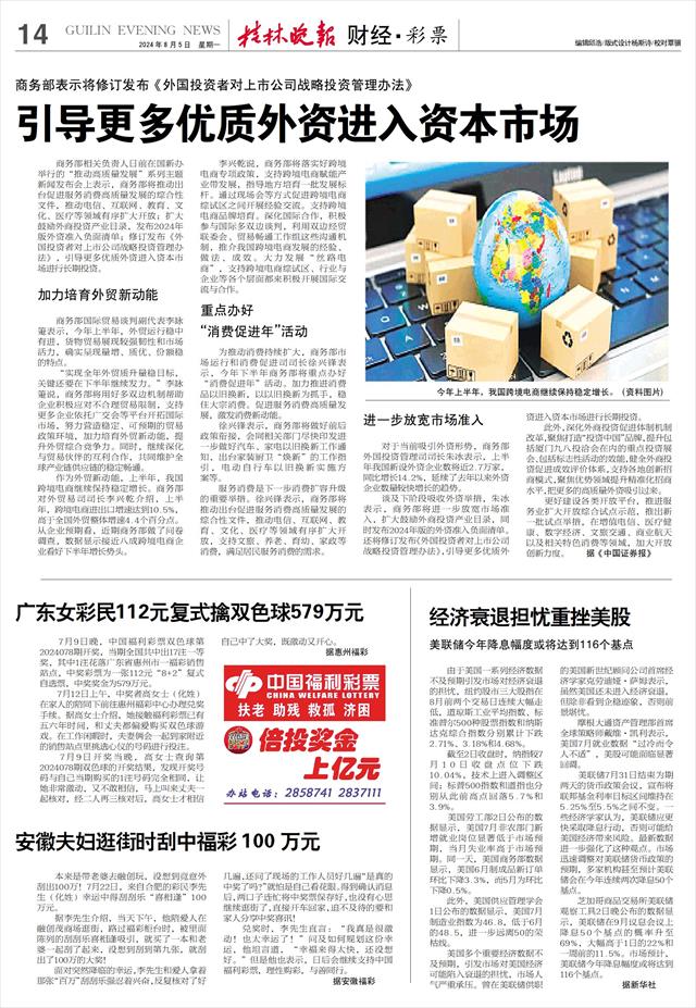 谈及下阶段吸收外资举措,朱冰表示,商务部将进一步放宽市场准入,扩大鼓励外商投资产业目录,同时发布2024年版的外资准入负面清单。还将修订发布《外国投资者对上市公司战略投资管理办法》,引导更多优质外资进入资本市场进行长期投资。