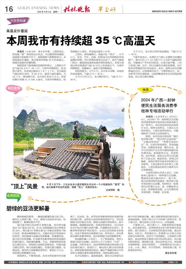 上周末,降雨减弱后,高温开始“冒头”。8月4日,全州、平乐、永福、阳朔及市区等相继发布高温橙色预警,烈日炙烤的感觉又回来了。我市气象部门预计,随着副高逐渐加强西伸控制我市,本周大部地区将出现最高气温35℃以上的高温天气。与常年同期相比,雨量偏少,温度正常到略偏高。