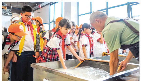 5月15日,在位于安徽泾县的宣纸产业园,参加研学游的小朋友在体验宣纸制作。 新华社发