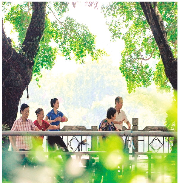 近日的一个清晨,几位市民在滨江路上早锻炼打太极。炎炎夏日,绿树成荫、风景优美的滨江路是市民休闲、锻炼的好去处。 记者滕嘉 摄