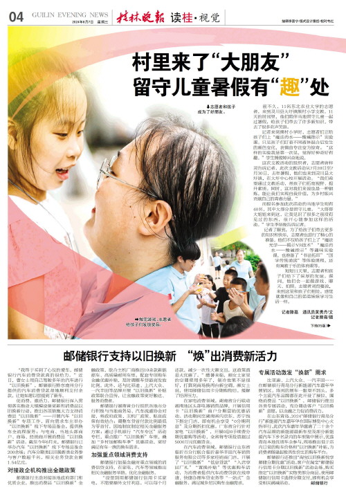 促消费,激活力。邮储银行深入贯彻落实推动大规模设备更新和消费品以旧换新行动,推出各项措施大力支持消费品“以旧换新”——开展汽车“以旧换新”专项工作,面向需求车主举办“以旧换新”线下专场品鉴会,提供换车全流程服务;与电商、当地头部商户、商场、经销商开展消费品“以旧换新”活动。截至今年6月末,邮储银行已举办汽车“以旧换新”线下专场品鉴会200余场;汽车分期类以旧换新类业务参与客户数超千名,相关业务贷款金额1.54亿元。