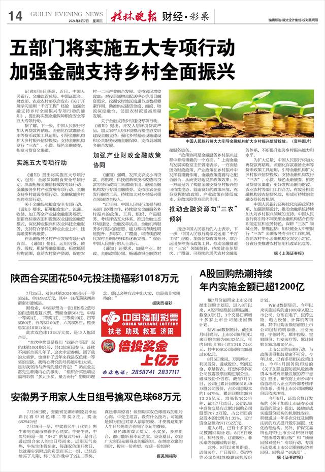 记者8月5日获悉,近日,中国人民银行、金融监管总局、中国证监会、财政部、农业农村部联合发布《关于开展学习运用“千万工程”经验 加强金融支持乡村全面振兴专项行动的通知》,提出将实施金融保障粮食安全等五大专项行动。