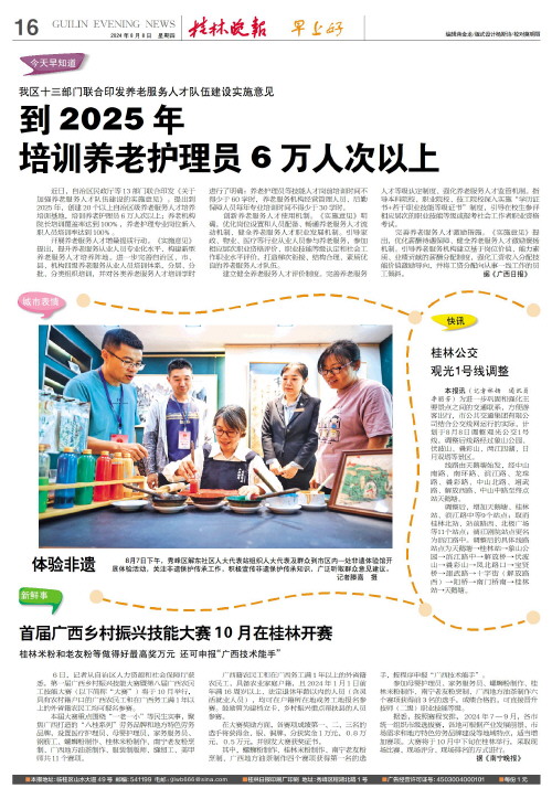 据悉,按照赛程安排,2024年7—9月,各市统一组织市级选拔赛,各地可根据产业发展前景、市场需求和地方特色劳务品牌建设等地域特点,适当增加赛项。大赛将于10月中下旬在桂林举行,采取现场比赛、现场评分、现场排名的方式进行。