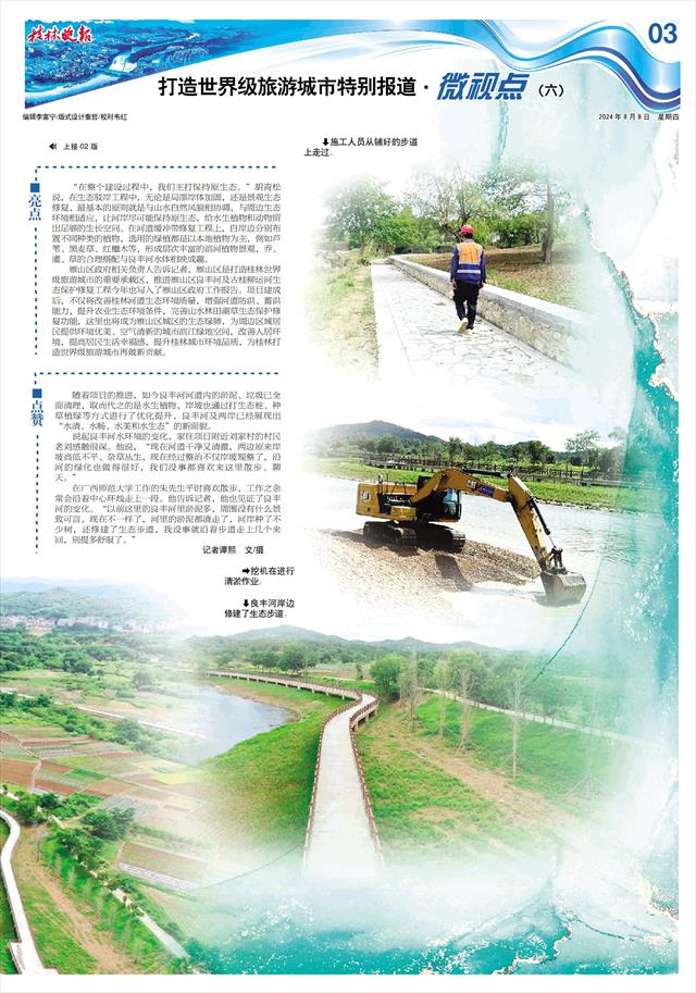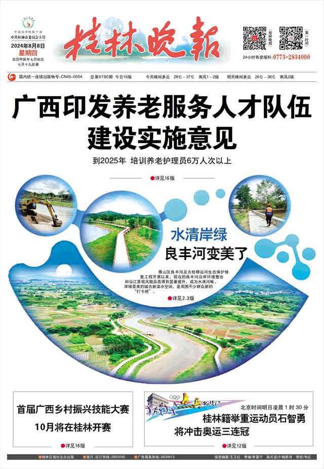 雁山区良丰河及古桂柳运河生态保护修复工程开展以来,现在的良丰河沿岸环境整治和沿江景观风貌品质得到显著提升,成为水清河畅、岸绿景美的城市新滨水空间,是周围不少群众新的“打卡地”。●详见 2、3 版