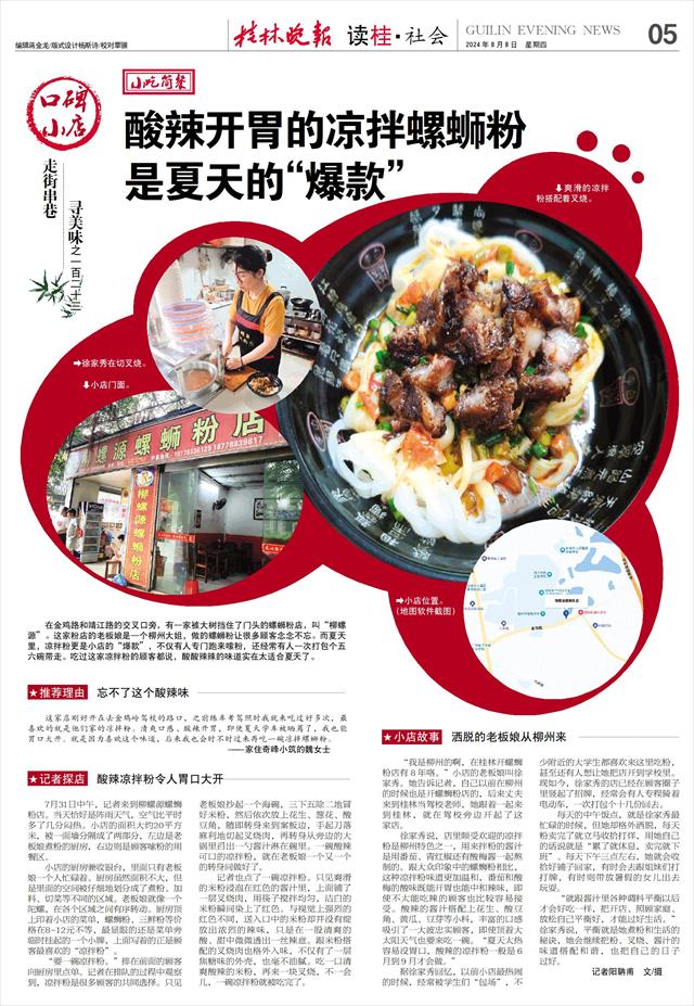 在金鸡路和靖江路的交叉口旁,有一家被大树挡住了门头的螺蛳粉店,叫“柳螺源”。这家粉店的老板娘是一个柳州大姐,做的螺蛳粉让很多顾客念念不忘。而夏天里,凉拌粉更是小店的“爆款”,不仅有人专门跑来嗦粉,还经常有人一次打包个五六碗带走。吃过这家凉拌粉的顾客都说,酸酸辣辣的味道实在太适合夏天了。